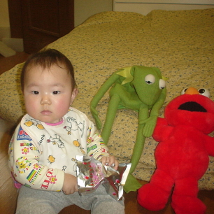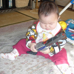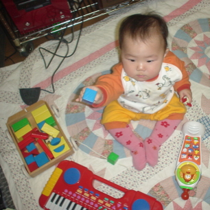 お兄ちゃんの「愛(あい)くん」が幼稚園に行ってて留守だったので、ぱるぱるは愛くんのおもちゃを貸してもらって、大喜びで遊びました。はじめて目にするおもちゃばかりで、目がらんらんと輝いているんだもんなぁ。(笑) 愛くんが小さい頃使っていたおもちゃを出してもらったのに、ぱるぱるが気になっているのは、今使っているマシンガン。えぇ〜っ! マシンガンがいいの? やっぱり、ぱるぱるは私の娘。さすがだわ。私も女のコのおもちゃには目もくれず、欲しがったのは全部オトコのコ用。車やマシンガン、怪獣。いっぱいもっていたわ。