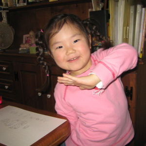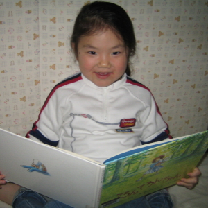 先生や私の真似をして、読んできかせてくれます。本当のところは、実際に読んでいるわけではなく、自分で覚えたストーリーを絵の展開に合わせてページをめくっています。これがなかなか板についていて、上手にやってくれます。