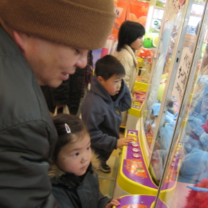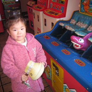 屋上のゲームコーナーで、「ワニワニパニック」を見付けたので、ハルカに「やってみる?」と聞くと、「やるやる♪」というので、やらせてみました。ワニを上手にたたき、なんと得点「73点」。4歳にしてはなかなかの成績じゃないでしょうか?