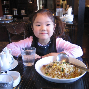 右)「ママ、このチャーハン、イマイチ。」紅虎のチャーハンはお口に合わなかったらしい。