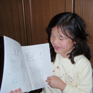 今日は、寝る前にハルカが読み聞かせをしてくれました。その名も「ハルカの物語」挿絵つきで自分が主人公の物語です。