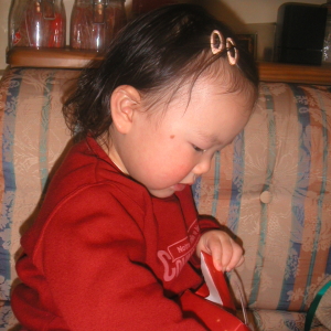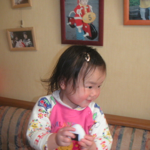 去年買った、サンタの衣装でしたが、今年も着られたので12月のユニフォームのように、たびたび着せていました。さすがに来年はもうだめでしょう。それに、ある程度大きくなってからの着ぐるみ状態は、実際かわいくないですよね。かわいいと思っているのは親だけで。(笑) そんなわけで、ぱるぱるのサンタルックもこれが着収め。