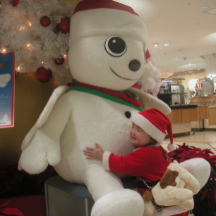 何回も握手に行っては戻ってくるので、私のコであるのはバレバレ。募金しないわけにもいかず、ぱるぱるに100円持たせて、お鍋に入れさせました。サンタさんなんだから、もらってばかりじゃね。(笑)