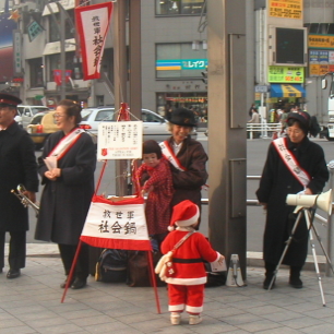 広小路の交差点に毎年恒例の救世軍の募金グループが出ていて、ラッパ吹いたり、腹話術の人形で、人集めをしていたのですが、ぱるぱるが腹話術の人形を「モモちゃんだっ!」と、言って、握手したり、抱っこさせてもらったり・・・。モモちゃんとは、ぱるぱるがかわいがっている抱き人形で、腹話術の人形とは似ても似つかないのですが。ぱるぱるには一緒なのですね。(笑)