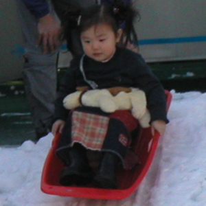 ぱるぱるもソリに初挑戦。ピングーのDVDを繰り返し見ているので、どういうものかは知っているし、憧れだったんですね。初めてにしては、なかなか上手。ビビリのぱるぱるのくせに珍しく怖がっていないじゃない。DVDのイメージトレーニングの威力かな?