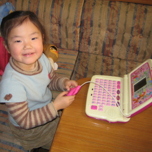 「ハルちゃん用のパソコンだ!」と、大喜びしているのですが、この手のおもちゃにありがちな電子音が私の脳波に攻撃をしかけてくるんですね。朝から晩まで、私の横でやってくれるので、頭痛寸前です。