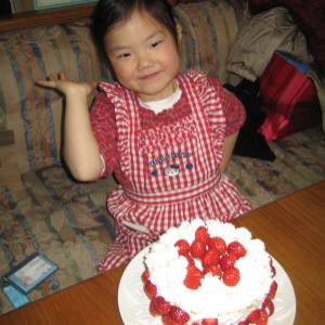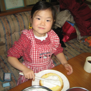 そんなことだろうと思っていたので、ハルカたちが出かけている間に、スポンジだけは焼いておきました。生クリームを泡立ててあげて、デコレーションはハルカのお仕事。エプロンをして、張り切って作ってくれました。うんうん、ちょっとデコラティブだけど、4歳がやったにしては上手よ。