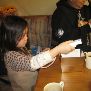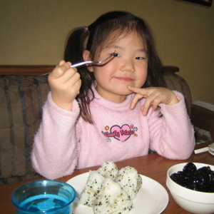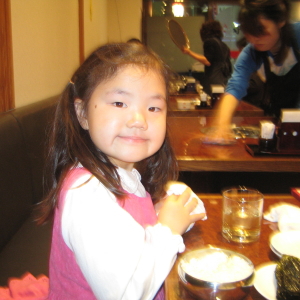 そのチャングムの店なので、ハルカったら、ワクワク。出てきたお料理も気に入ったらしく、「中でチャングムが作ってるの?」と、厨房を気にしていました。その言葉にお店の人も他のお客さんも大ウケ。ハルカにはサービスの海苔が山ほど出てきて、食べやすいようにお姉さんが付きっきりで焼肉をカットしてくれました。