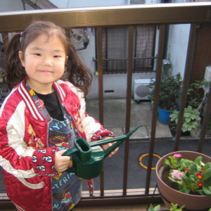 右)ハルカの花壇。1日に何回も土が乾いていないかチェックしています。そんなにすぐ乾かないってば。