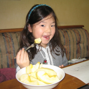 パパの好物のお多福豆はハルカも大好物。パパが宴会で遅いのをいいことに、「ママ、ちょっとだけ食べていい?」と、さっそくお多福豆のおねだり。ちょっとだけだよ。どうぞ。