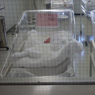 11時ごろ、小児科の先生に呼ばれて、新生児室にいくと、黄疸が強いから姫を光線治療すると言われました。夕べ、手元に帰ってきてから、確かに姫はおとなしくて、よく寝てくれたもんね。あれって、イイ子っていうわけじゃなくて、具合が悪くておとなしかったわけ? 姫は授乳の時に30分だけ、外に出られて、後は日焼けサロンのブースのような中に入れられることになりました。目のところは光が入らないように目隠しされちゃって、オムツ1丁でブースの中へ。なんか痛々しいわ。
