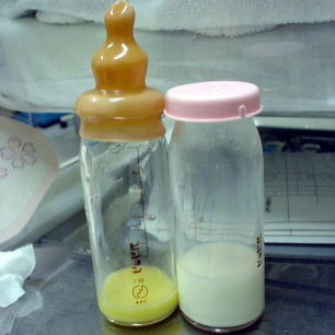 左上)右は普通の粉ミルク。左の黄色いのが「初乳」です。