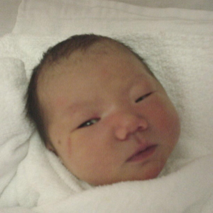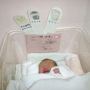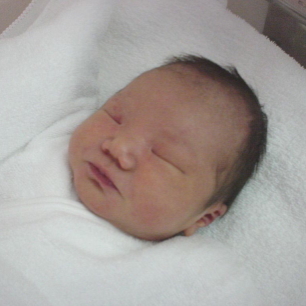 これが! これがめちゃくちゃ痛かった。3針って聞いてたけど、作業が永遠と続くように感じた。本当に3針? あんまり痛いから、気を紛らわそうと左腕をかんでいたら、次の日、すごい内出血になってた・・・。さらに、これから8時間はトイレに行けないからと、カテーテルのアンコール。あぁ〜ん、出産って痛いことのオンパレードだわ。(泣)その作業が終わる頃、赤ちゃんもきれいになって私の元に帰ってきた。赤ちゃんの足首には私の名前と番号がついていて、私には同じ番号のついた指輪が渡された。分娩台で横たわってる私の腕に赤ちゃん。なんともぎこちなく腕に抱く。自分の子なのに恐る恐るって、感じになっちゃう。ダンナも分娩室に入ってきて、ビデオやらデジカメで撮影開始。はっきり言って、美しくないママだと思うよ。頭はぐちゃぐちゃだし、疲れ果ててるんだからね、私。2時間休んで、持参した和式のユカタに着替えて、車椅子で病室へ移動。ここでダンナとお義母さんとはさよなら。
