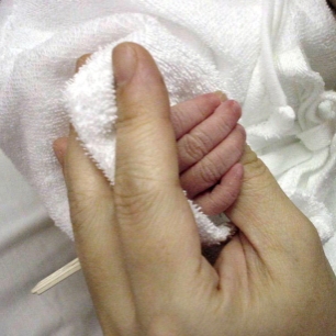 うんち君とおしっこ君してる。きれいにしようねぇ。うんち君の後は、ぬるま湯でぬらしたカット綿でおしりを拭いてあげます。さぁ、気持ち良くなったところで、おっぱいを飲んでくれたまえ。