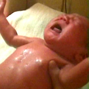 そして陣痛はどんどん激しくなってくる。「さっきのいきみ、3回ずつしますよ。」と、助産婦さんに言われてやるんだけど、3週間の入院ですっかり体力と筋力が落ちた私、その3回ってのが続かないの。思わず赤ちゃんに「頼む! 1回陣痛お休みして、ママを少し休ませて!」って、頼みたい気分だった。「いきみ」が疲れてしまってできないの。(後から知ったけど、分娩台の足を固定する台、壊れて力が入らない角度になってた・・・。) ともかく2回ずつでもいきんで、がんばること30分。助産婦さんが先生を呼んできて、いよいよという空気が分娩室に流れた。