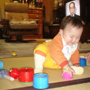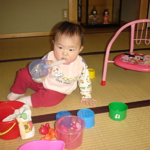 おととい、美紅ちゃんのママようこさんに、ぱるぱるはおもちゃをもらったのですが、これが超お気に入りみたいです。ミキハウスのおもちゃで、数字やひらがなが側面に書かれたカラフルなカップ。重ねてみたり、積んでみたり、お風呂に持っていって、お湯を入れてみたりと、起きてから寝るまで、これで遊んでいます。