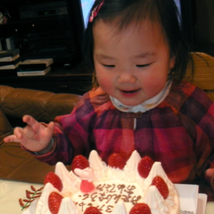夕方、バースデーケーキをぱるぱると取りにいきました。ケーキ屋さんで、ウインドーに飾られていた自分のケーキを発見した途端、うれしそうに、「ハルちゃんのケーキ! やた、やた! 2才〜♪」とハイテンションで喜んでいました。