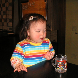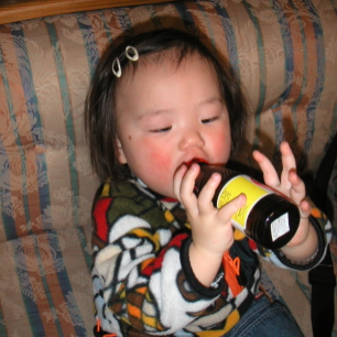 そんなぱるぱるはダンナが会社でもらってきたドリンク剤のようなビンに入った義理チョコを口にくわえて、飲むふりをしながら、「元気! 元気!」なんて言ってます。これもたぶんCMを見て、そういうもんだと覚えたらしい。まだ深い意味なんてわかっていないでやっているんだけど、覚えるのが早いよね。