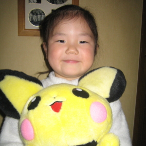 私のおじさんに法事の時にもらったピチューのぬいぐるみを気に入ってるハルカ。自分の妹にして遊んでいます。