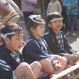 振る舞い酒やお餅、やきそばが配られ、盛大なお祝いになりました。ハルカたち元三島五神太鼓も景気付けに太鼓の演奏をしました。本番はほとんど夏なので、ハルカたちちびっ子の半だこ姿は、足が寒そう。今日は暖かかったから、よかったね。