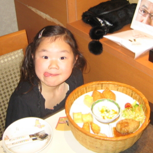 お豆腐大好きのハルカは、お子さまご膳をパクパク。おいしいよね。でもカゴが高くて、中のお料理がちょっと食べ辛かったね。