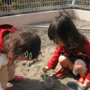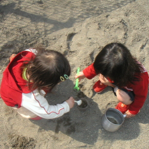 今日はあーやんを誘って、お砂場遊び。フライパンやシャベルを使って、合理的かつ豪快に砂を集めるあーやんに対して、スプーンでちょびっとずつ砂を集めるぱるぱる。うわぁ〜、そんなトロくさいことやってたら、山1つ作るのに100万年くらいかかっちゃうじゃないか。 あぁ、こりゃ駄目だ・・・。