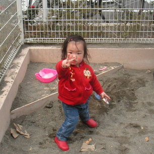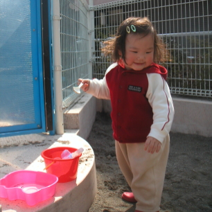 お砂場遊び、これもきれい好きのぱるぱるにはなかなかの難関です。なにせ、手に砂がつくのがきらい、靴に砂がかかるものきらいという致命的な問題が。(笑) うそだろぉ〜? 私なんか毎日泥だらけで、足から血を流してても平気で遊んでたぞ。ぱるぱるをお砂場に入れると、そろりそろりと遊んでいて、だれか他の子が入ってくると、砂を飛ばされるのがイヤで出てきちゃうんだもん。