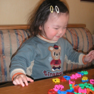 ぱるぱるはモノにはそれぞれ名前がついていて、名前は記号で表せるということをうっすらわかっているようで、マグネットのそれぞれ違う形のものを適当に並べて、「はるかの『は』!」って、ウソばっかりに言って遊んでいます。、「か」だろうが、「む」だろうが、全部「は」にしちゃう。(笑) そうやっているかと思うと、色の名前を言って、違う遊び方になっちゃうんだよね。色は得意分野のようで、20色くらいの名前をしっかり覚えていて、色もわかっています。ちなみに今1番好きな色はブルーだって。