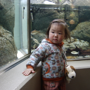 私が小さいころの水族館って、大人に抱っこしてもらわないと見えないところに水槽があったんだけど、今の水族館は床からすぐに立ち上がっている水槽なので、ぱるぱるも立った状態で見ることができます。入ってすぐの水槽は、ぱるぱるにもおなじみの錦鯉。横から見てすぐに鯉だとわかったのは偉かったね。 どの水槽も大きいんでびっくりしたみたい。ぱるぱるからみたら、本当に海や川に入っているように感じるのかも。とても楽しかったらしく、夜寝る前にも布団の中でしきりに水族館の話を私にしていました。
