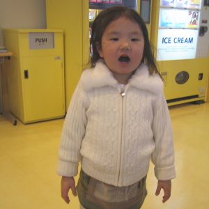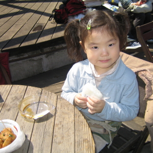 ちょっと寒いけど公園で、おやつにしようと、一口かじって、しかめっ面のハルカ。