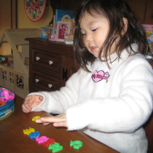 「りんご」、よしよし。「点々」の位置もオーケー。「さかな」、「さ」と「ち」を間違えずにできました。次は何を作るのかな? 「は・る・か」・・えっ? 何が続くの?と思ってみていたら、「さま」を付けてます。