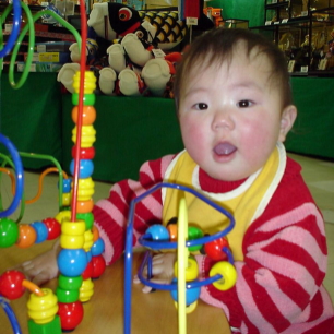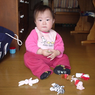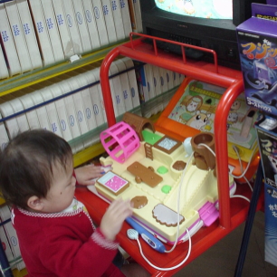 寝ているうちにデパートに移動。(どうも私は公園とか外で、ぱるぱるのオムツを交換する気にならないのよね・・・。) デパートについてすぐに起きたのでベビー休憩室でオムツを交換してからおもちゃ売り場に。自分が持っているおもちゃを見つけると、そこに行って遊びたいというので、靴を履かせてあげると、一目散でおもちゃに近づくぱるぱる。他の子がやりにくると、相手が自分よりもぅっとお兄ちゃんお姉ちゃんであっても、こうやるんだと教えているつもりのぱるぱる。(笑)