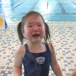 ガラス越しにぐちゃぐちゃに泣いて、「ママーっ!」と叫んでいるのが聞こえます。ありゃりゃ、これじゃプールに入ることもできやしない。