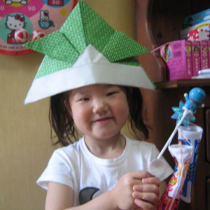 年長さんが作ってくれたカブトをかぶって、歌っているハルカは、とてもうれしそうでした。