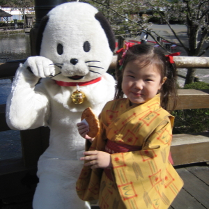 ホテルに荷物を置いて、さっそく日光江戸村に。江戸村で「町人に大変身」っていう企画をやっていて、着物好きのハルカのために、町娘への変身を予約しておいたのよね。あいにくの天気だったけど、番傘を借りて、黄八丈の町娘ハルカと江戸の町を流すわよ。雨がうっとうしいなぁと思っていたら、日本橋のところで写真を撮った途端、雨がやんじゃった。ナイス!!