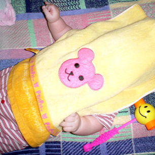 最近、WEBの赤ちゃんショップをサーフィンしてるんだけど、ベビーカーとかを作っているコンビがやってる「combi mini」っていうブランドのお洋服がかわいくて、なかなかお手ごろな値段なもんで、試しに買ってみた。いやぁ、モデルの子がかわいいのよぉ。今日、届いたんだけどさ、ぱるぱる、ゴメン! ママったら、色番号間違えて、頭で考えてたのと違うのがきちゃったよ。きゃー、確認メールも来てたのに、確認してなかったし・・・。ママがぱるぱるに着せたかったのはオレンジ色だったのよ。まっ、いいよね、黄色もかわいいからさ。泣くなよぉ、ぱるぱる。しかし、着せてみた感じは、色の違いの問題だけでなく、やはりWEBのイメージと違うなぁ。(笑)