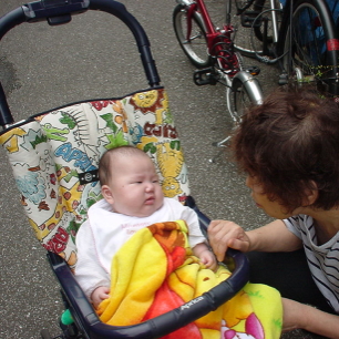最初、抱っこじゃないのが気に入らなかったみたいで、泣きましたが、乗り物だとわかったら、もうご機嫌♪ よかったよかった、気に入ってくれたのね。そうとわかれば、町内を流しに行くわよぉ〜!