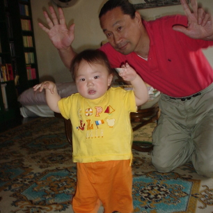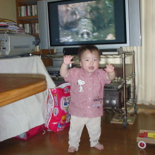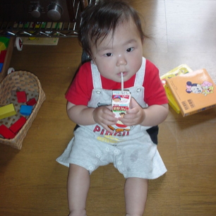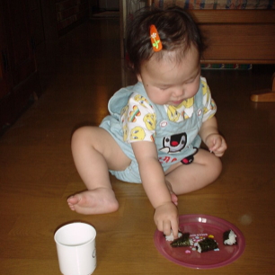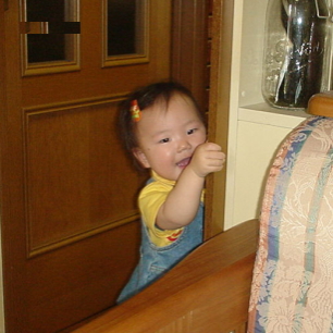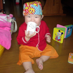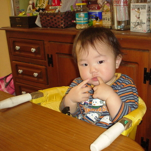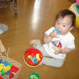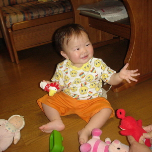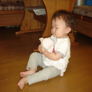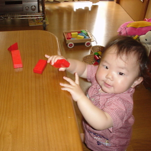 イスに登ってモノを取ろうとしたり、私を追って、階段を上ったり・・・。すっごい行動範囲が広くなってしまった。アンヨも歩くというより、激走に近いので、勢い余って転んだり、ぶつかったりで、ぱるぱるの体は青タンだらけ。決して私が幼児虐待をしているわけではありません。(笑) そんなに度胸があるなら、お外でのアンヨなんて簡単なはずなのに、お外じゃ、いまだに歩けないの。公園にせっせと通って、他のチビッコを見せているんだけどね。