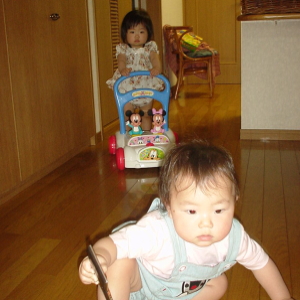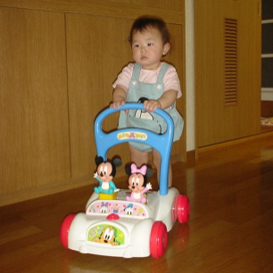 ぱるぱるもアンヨをはじめて、置いてきぼりになった感じのあーやん。二人がタッタッタと歩いているのを見て、がぜんやる気が出てきました。それまで、つたい歩きはするけど、歩行器はキライで、遊ぼうとさえしなかった彼女が、カタカタをやりはじめたのです。こりゃ、もうじき歩くね。