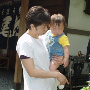 右)尾花のおばちゃんに抱っこしてもらって、お池の見物。