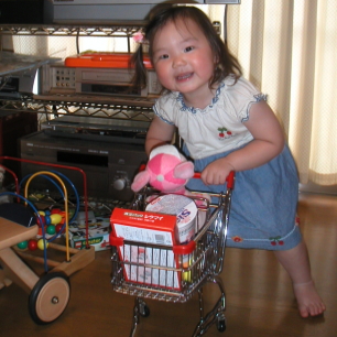 今日、違う用事でビックカメラに買い物にいったら、PCサプライ品のコーナーにこのカートを発見。即ゲットしました。(ビックカメラならポイントつくもんね。) ぱるぱるに見せたら、大喜び。ちょっとぱるぱるが押して遊ぶには低いのと、前カゴになにか錘になるように荷物を入れてあげないと、転んじゃって危ないんですが、ぬいぐるみを幼児用のシートに座らせて、お買い物ごっこのはじまりです。「コーン、買わなきゃ! お肉、安いわね。」なんて、聞いているとこっぱずかしいことを言いながら、遊んでいます。