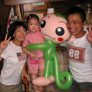 今日は、花火とウキウキモンキーを持って遊びにきてくれた2人。スーちゃんにさっそくモンキーを膨らましてもらって、大喜び。