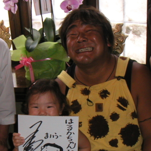 近所でハルカをかわいがってもらっているお好み焼屋さんに、テレビ取材で石塚さんがくるという情報を掴んだ私は、さっそく電話で了解をもらい、ハルカにあわせてあげることにしました。