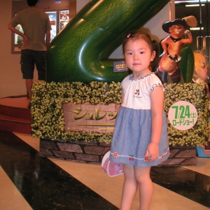 シュレックのDVDを家で何回も見て、気に入っていたようなので、今日は2を見に映画館に連れて行きました。映画館で映画を見るのは2回目のハルカ。