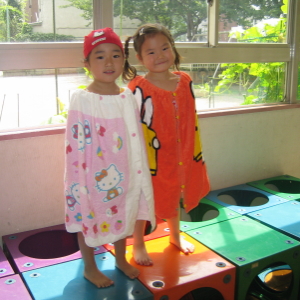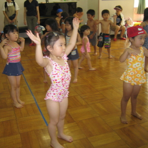 水着に着替えて、遊戯室で先生たちと準備運動をしますが、階段で5階まで上がるので、準備運動は万端ですね。毎日これをやったら、私もいい運動になりそう。(笑)