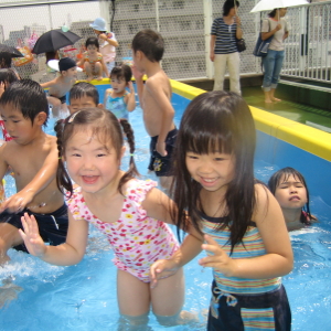 さて、小学校用プールの横に、幼稚園のプールがあります。水位はハルカたちの膝くらいなので、泳げる深さはありません。それが気に食わないのか、ハルカのやつはプールには入らず、その隣に用意された未就園の弟妹が使う小さい子用の水遊びスペースで、ずっと遊んでいるんですよ。バケツに水を汲んだり、オモチャで遊んだり。これじゃ、プールに来ている意味ないじゃん。せっかく水着を着ているのに、ぜんぜん濡れていないし・・・。
