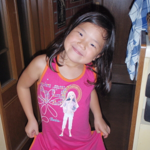 公文に迎えに行ったら、ハルカが朝とは違う洋服を着ていました。学童クラブに着替え用に置いておいた洋服の下着姿です。