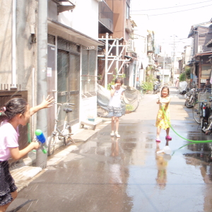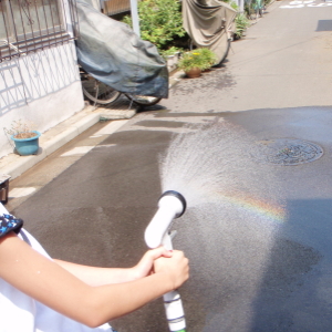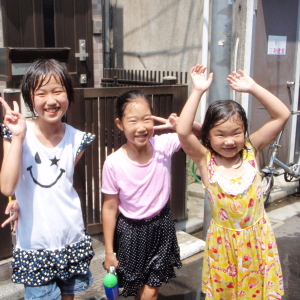 ハルカたちは、家の前で水遊びです。最初は水鉄砲で遊んでいたのですが、盛り上がったらホースで景気よく水をまき、みんなビショビショ。