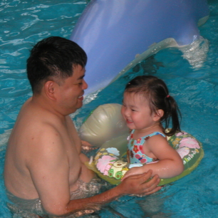 だいぶ慣れただろうと、ちびっこプールのおすべりに連れて行きましたが、ビビリのハルカはダメダメ。大泣きして滑り降りることができません。