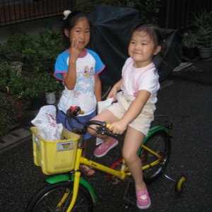 自転車はダンナが会社の人に、もう使わなくなった子ども用自転車をいただいたもので、新しく買ったわけではないのですが、ハルカは「パパが買ってくれた!」と大感動しています。どう見ても、新品じゃないんだけど、ハルカにはそんなことは関係ないようで、リビングにいたダンナにキス攻撃。(いつもは言わないとしません。)